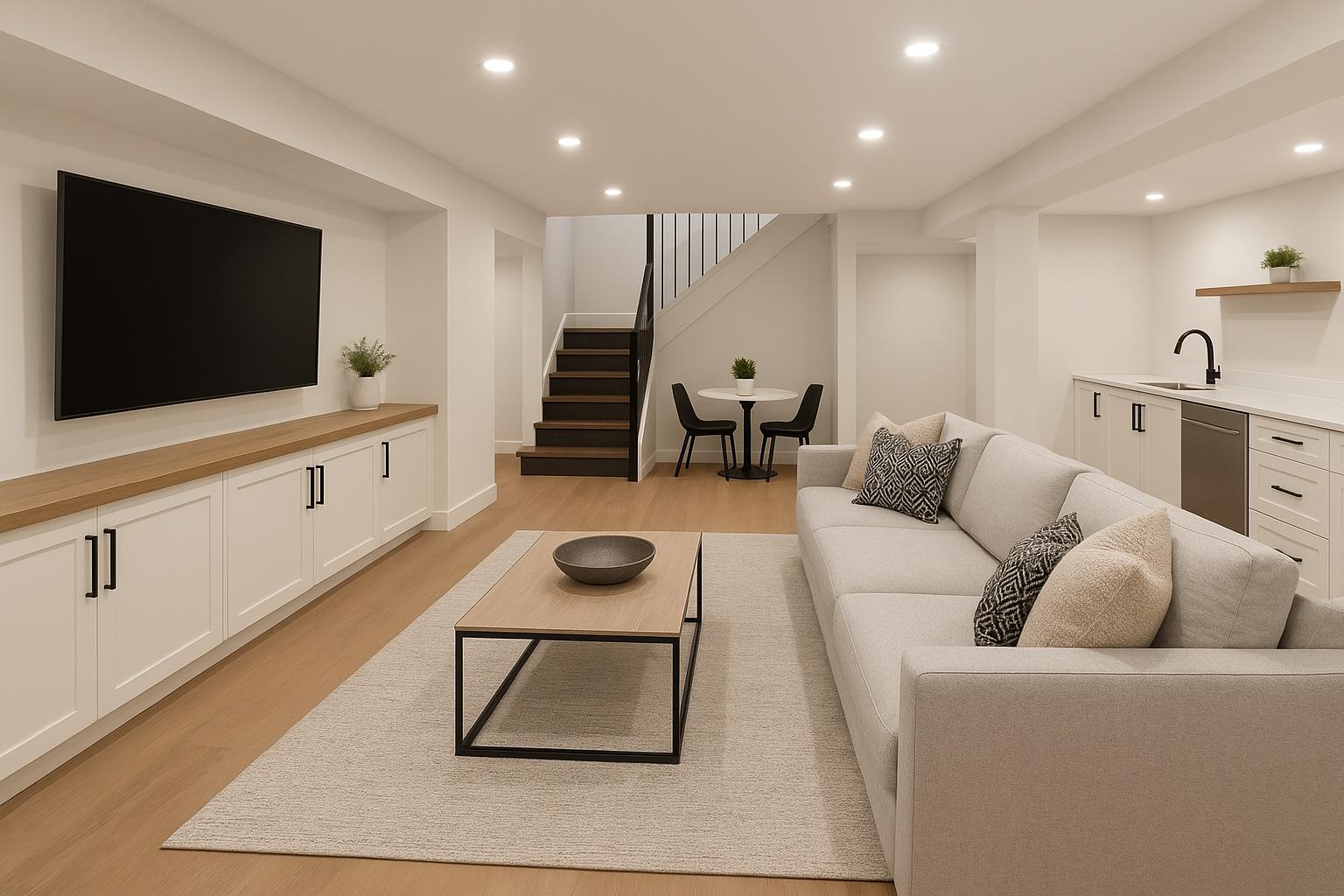 Transforming unfinished basement into a functional and stylish living area. Custom flooring and recessed lighting turned the space into a comfortable, cozy entertainment room.