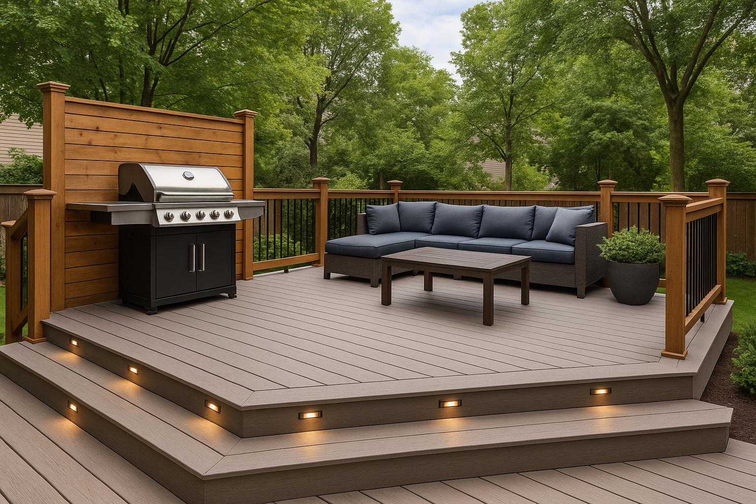 A full reconstruction of an outdoor deck, blending modern design with practical outdoor living features, complete with professional staining and painting finishes.