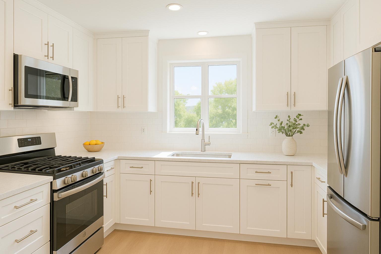 Renovated kitchen featuring modern cabinetry, updated appliances, stylish countertops. and new flooring. A perfect blend of function and design.