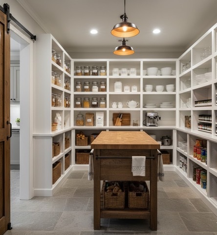 Easy to access pantry with multiple shelves, accommodating a large variety of containers.