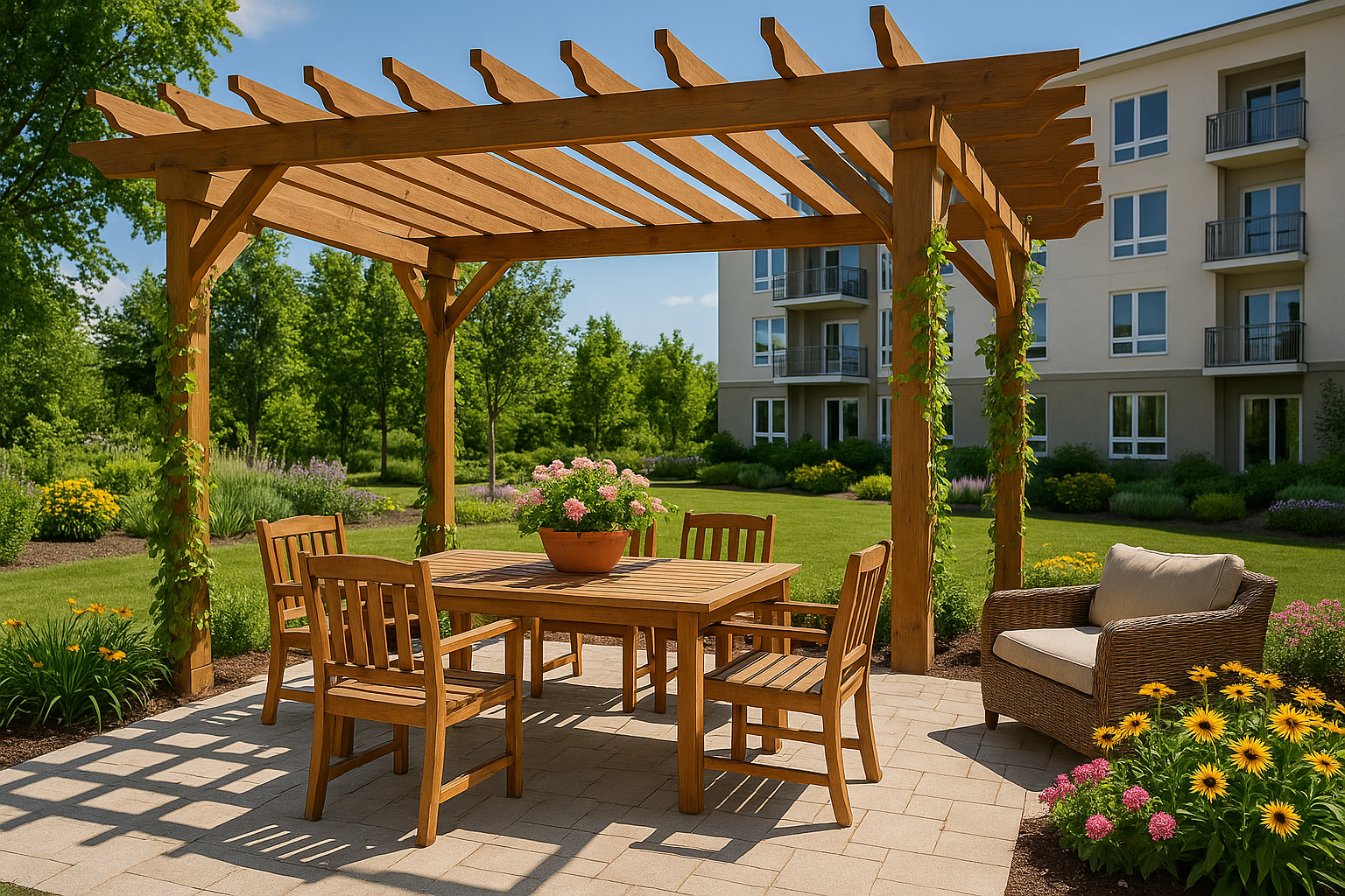 Pergola providing shade, and comfortable outdoor seating area. Perfect for dining and entertaining.